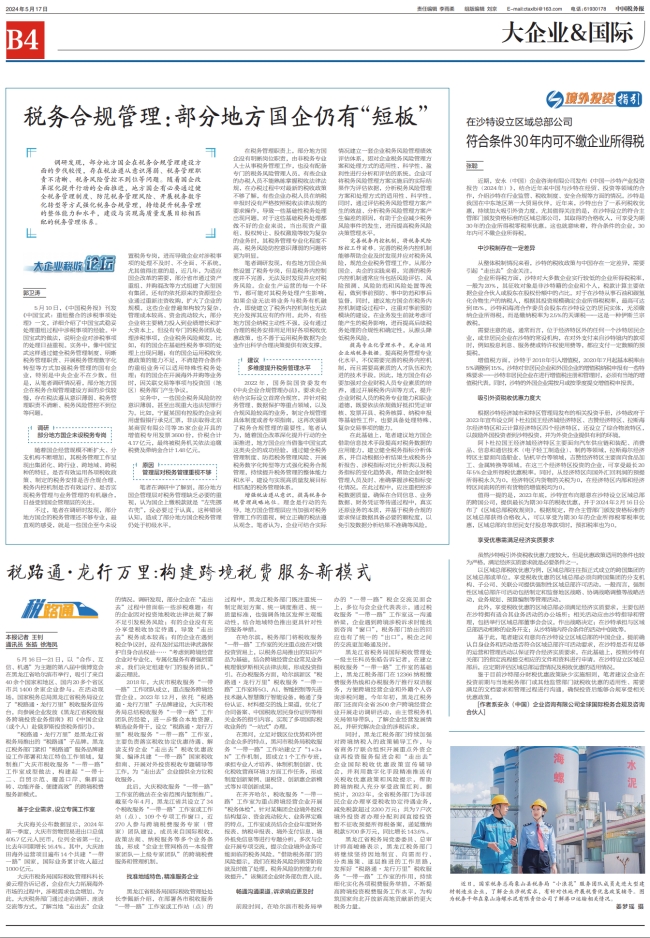 大庆市税务局国际税收管理科科长姜云理告诉记者,企业在大力拓展海外市场的过程中,涉税需求也会增加。为此,大庆税务部门通过走访调研、座谈交流等方式,了解当地“走出去”企业的情况。调研发现,部分企业在“走出去”过程中曾面临一些涉税难题:有的企业因对投资地税收法律法规了解不足引发税务风险;有的企业没有充分享受税收协定待遇,导致“走出去”税务成本较高;有的企业在遇到税企争议时,没有及时运用法律武器保护自身合法权益……“考虑到跨境经营企业对专业化、专属化服务有着强烈需求,我们决定组建专门的服务团队。”姜云理说。