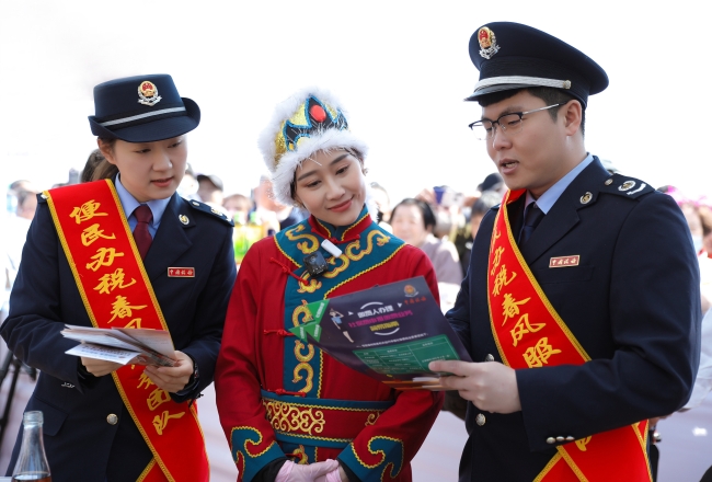 4月9日,黑龙江省佳木斯市举办了首届民俗节日“喊江节”,万名市民齐聚松花江畔,参加“万人喊江”活动。佳木斯市税务局的税务干部,组成税收政策宣讲团积极参与到活动中来,走进活动现场的非物质文化遗产展览摊位开展税费优惠政策宣传。
