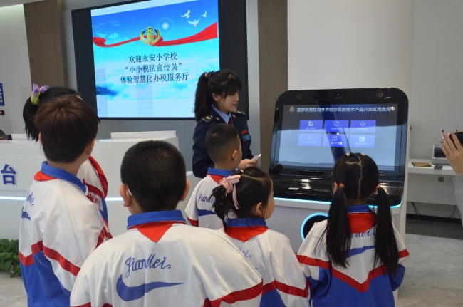 齐齐哈尔高新技术产业开发区税务局以“实地体验+事例教学”为切入点,深入开展“税润童心筑梦红岸”系列活动,邀请齐齐哈尔市永安小学的学生代表前往办税服务厅,沉浸式体验一次从进门刷脸认证到使用智能导税设备自助叫号的整个流程。“党员先锋岗”工作人员用形象的故事、有趣的动画、通俗易懂的语言为学生们讲述什么是税收、税收的来源和用途、生活中的税收等知识,让学生们明白税收“取之于民、用之于民”的道理。