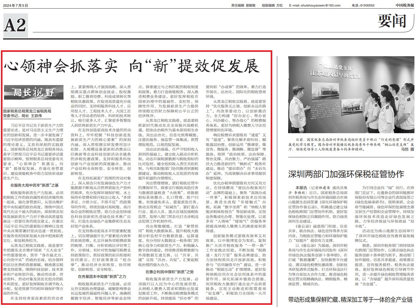 习近平总书记关于新质生产力的重要论述,是对马克思主义生产力理论的创新和发展,进一步丰富发展了习近平经济思想的内涵,既具有重要的理论意义,又具有深刻的实践意义。国家税务总局黑龙江省税务局认真学习贯彻习近平总书记重要讲话重要指示精神,按照税务总局党委有关要求,“心领神会”抓落实,向“新”提效促发展,在强化垂管意识、建设效能税务中助力加快形成新质生产力。