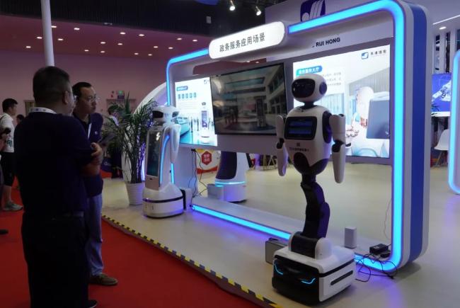 在B216展区,不少参观者正和东港瑞宏科技有限公司打造的新型政务服务机器人“天轶”热情互动,“天轶”也挥动双臂,回答着各类涉税问题。