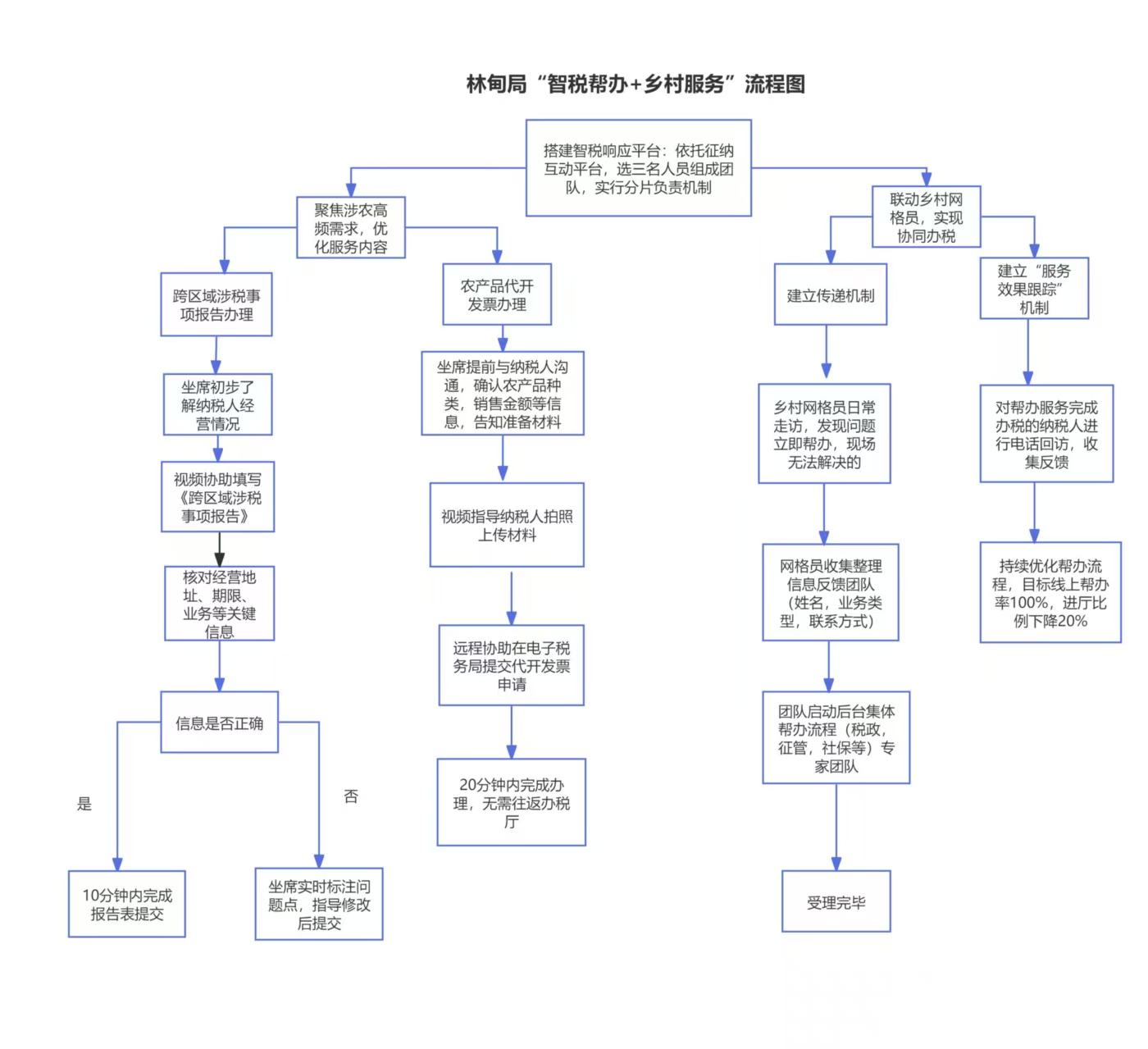 为让涉农办税更 “省心化”,满足乡村纳税人办税需求,现公示 “智税帮办 + 乡村服务” 流程。乡村纳税人可通过申请,由帮办人员协助办理业务,包括上传资料、视频助写等;税务部门会核对纳税人经营地址、信息等,对于无法线上解决的问题,会立即安排人员现场走访处理;同时建立发票传递、跨区域涉税事项办理等机制,聚焦涉农高频需求优化服务内容,还会对服务效果进行跟踪,切实降低涉农办税难度,提升乡村纳税人办税体验。