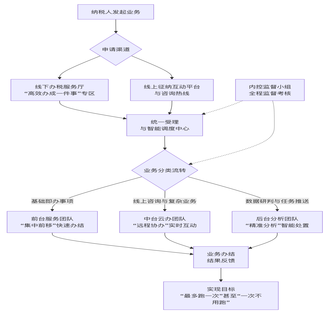 为实现复杂税费事项 “最多跑一次”,高效解决纳税人急难险重问题,现公示大庆市“管服一体化”征管模式办税流程。纳税人的业务需求被精准分派至前台、中台、后台三个专业团队:前台集中快速处理简单业务;中台通过线上平台为纳税人提供实时咨询和远程协办;后台则依托数据分析,主动为纳税人推送所需服务。整个流程由内控监督团队全程保障,确保服务规范、廉洁、高效,最终实现“进一扇门,办所有事” 甚至 “一次不用跑” ,极大节约了纳税人的办事时间和成本。