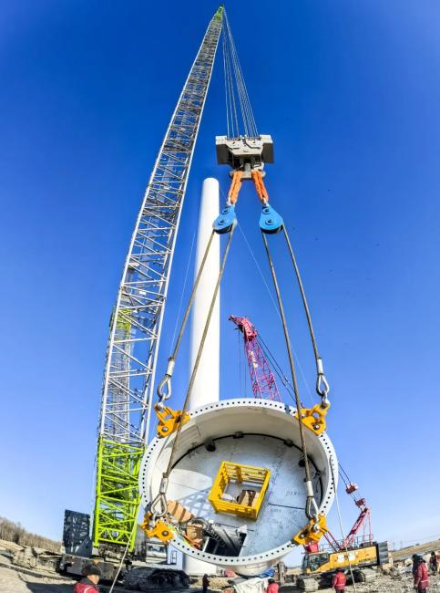 白城市通榆县八面30万千瓦风电项目风机塔吊组装现场。