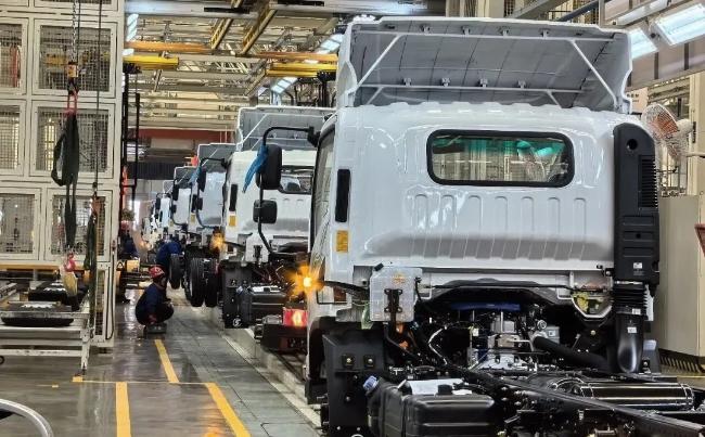 陕汽集团商用车有限公司生产的即将出口中亚的重卡汽车正在整装待发。