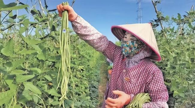 三亚市崖州区崖城镇拱北村种植户为新鲜采摘的豇豆绑上溯源二维码。
