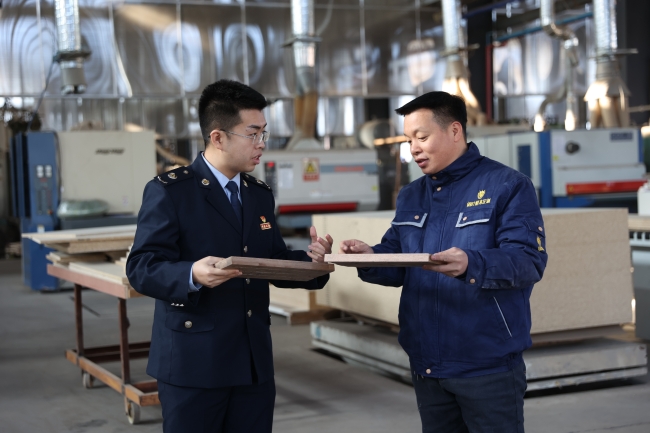 国家税务总局鸡西市鸡冠区税务局最近开展木材加工制造企业走访,针对企业在税收政策适用、办税合规操作等方面问题,进行答疑指导。图为税务干部在鸡西市华伟木业有限公司生产车间了解木材加工、制成品销售等情况。