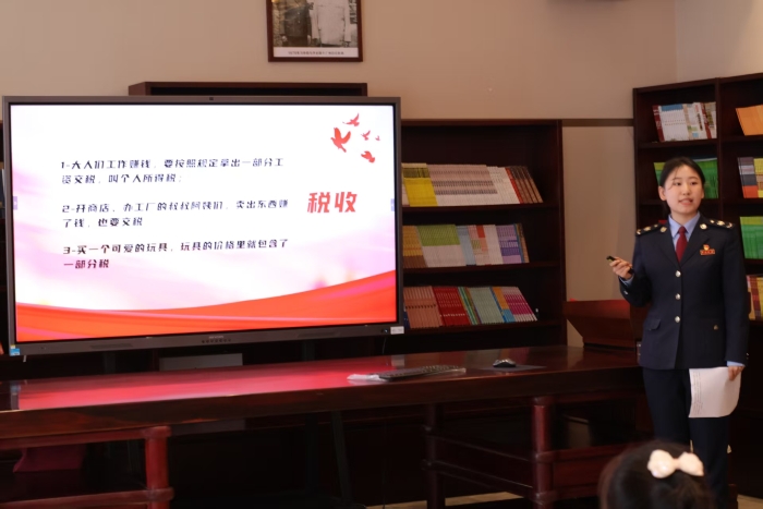 活动中,税务干部结合《税法教育读本》精心制作PPT,以生动形象、图文并茂的方式向同学们讲解税法知识。从税收的历史渊源到现代税法的重要地位,从税收来源到税收作用,将抽象的法律条文转化为一个个鲜活的案例和图画,以通俗易懂的语言深入浅出地进行了讲解,牢牢地吸引了同学们的注意力,激发了同学们对税收的兴趣和热情。