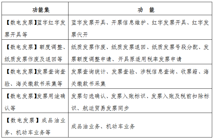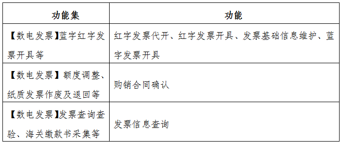 电子税务局纳税人端将发票业务功能进一步细分为五类,分别是:【数电发票】蓝字红字发票开具等;【数电发票】额度调整、纸质发票作废及退回等;【数电发票】发票查询查验、海关缴款书采集等;【数电发票】发票用途确认等;【数电发票】成品油业务、机动车业务等五类,供法定代表人、财务负责人自由配置,办税人员在没有配置相关功能集确认授权时,不能操作数电发票业务。具体细化功能集如下: