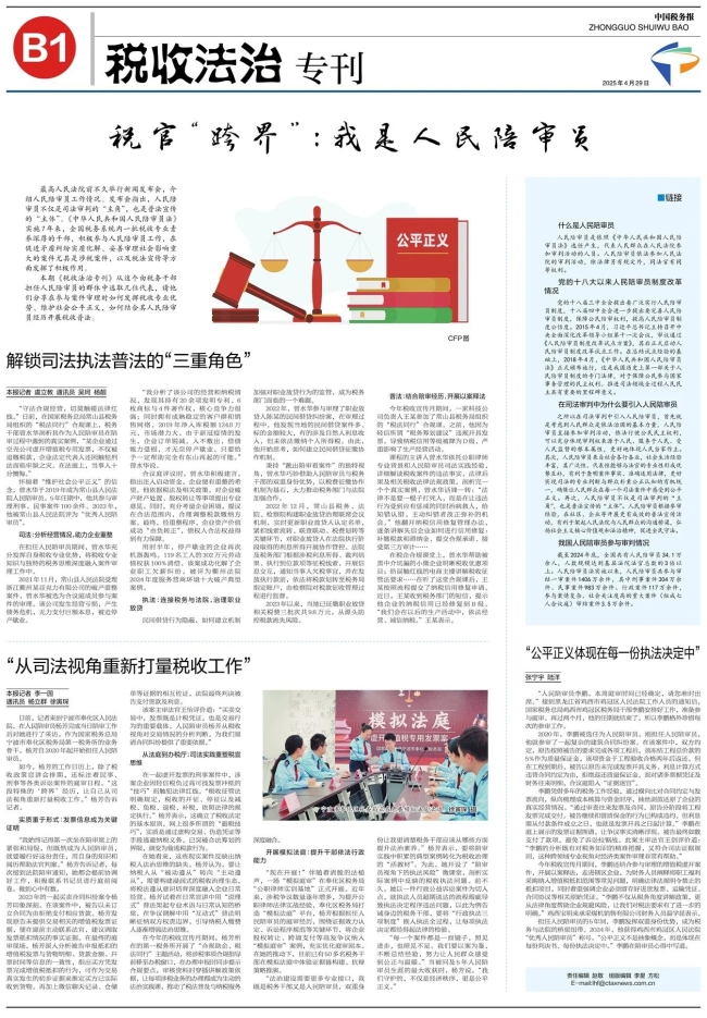 担任人民陪审员的5年间,李鹏发挥双重身份优势,成为税务与法院的桥梁纽带。2024年,他获得鸡西市鸡冠区人民法院“优秀人民陪审员”称号。“公平正义不是抽象概念,而是体现在每份判决书、每份执法决定中。”李鹏在陪审员心得中写道。
