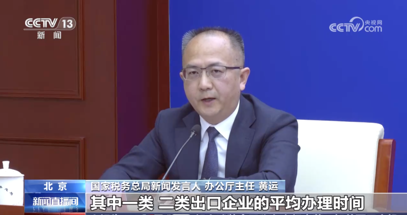 国家税务总局新闻发言人、办公厅主任 黄运:其中一类、二类出口企业的平均办理时间进一步压缩至3个工作日以内,我们推出出口海外仓货物“离境即退税”的创新举措,加快了跨境电商退税资金的周转,助力出口海外产企业高质量发展。