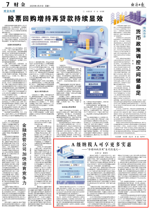 目前,各地都在积极探索,让A级纳税人可享受的激励措施不断扩围出新。在云南,A级纳税人享受增值税留抵退税“随报随审”、发票领用“绿色通道”等专属服务;在河北,税务部门与多部门协同推出“智信享”联合优创计划,让A级纳税人出游、住宿、体检能享优惠价格;在青海,A级纳税人可享项目审批“直通车”、土地供应优先保障、审查简化流程等联合激励。