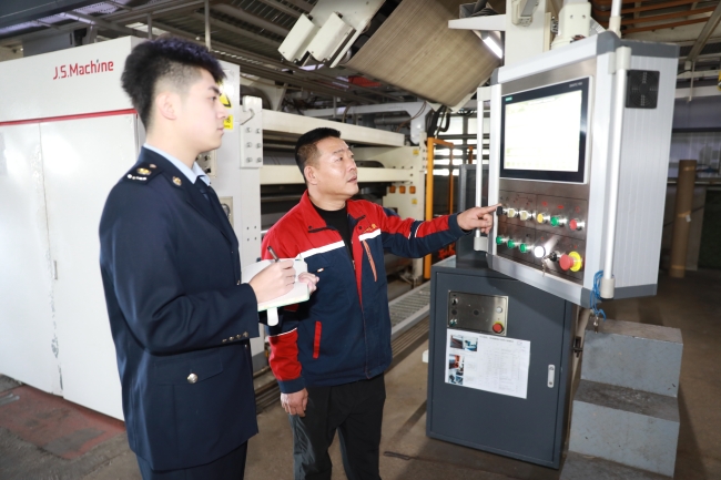 近日,国家税务总局绥棱县税务局干部走进黑龙江鑫品包装有限公司,围绕行业特性,开展政策精准辅导,引导企业分析并防范潜在涉税风险,助力企业合规健康发展。图为税务干部在车间了解企业生产流程。