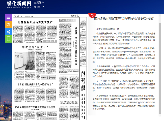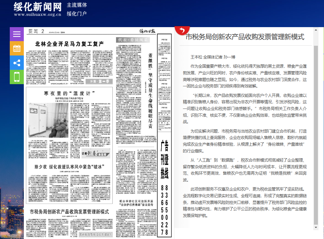 《绥化日报》等主流媒体对我局优化税收营商环境工作进行系列采访报道,2月26日刊文:《市税务局创新农产品收购发票管理新模式》。