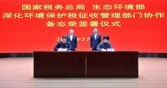 2月27日,生态环境部和国家税务总局在京签署《深化环境保护税征收管理部门协作备忘录》,进一步深化两部门协作,持续用税收经济手段保护生态环境,推动经济绿色转型,服务保障美丽中国建设。生态环境部部长黄润秋,国家税务总局党委书记、局长胡静林出席签署仪式。 此次备忘录的签署,是两部门深入贯彻党的二十届三中、四中全会关于完善绿色税制、促进绿色低碳发展部署的重要举措,也是树立和践行正确政绩观、协同推进生态文明建设、提升生态环境治理现代化水平的具体行动。根据备忘录,生态环境部和国家税务总局将进一步深化在信息共享、征管服务、常态复核、联合监管等领域的合作,共同指导地方各级生态环境和税务部门深化协作,不断拓展协同共治的深度和广度,持续推进高效能治理、促进高质量发展。 生态环境部党组成员、副部长郭芳,国家税务总局副局长赵静代表两部门签署备忘录。两部门有关单位负责同志参加仪式。 |