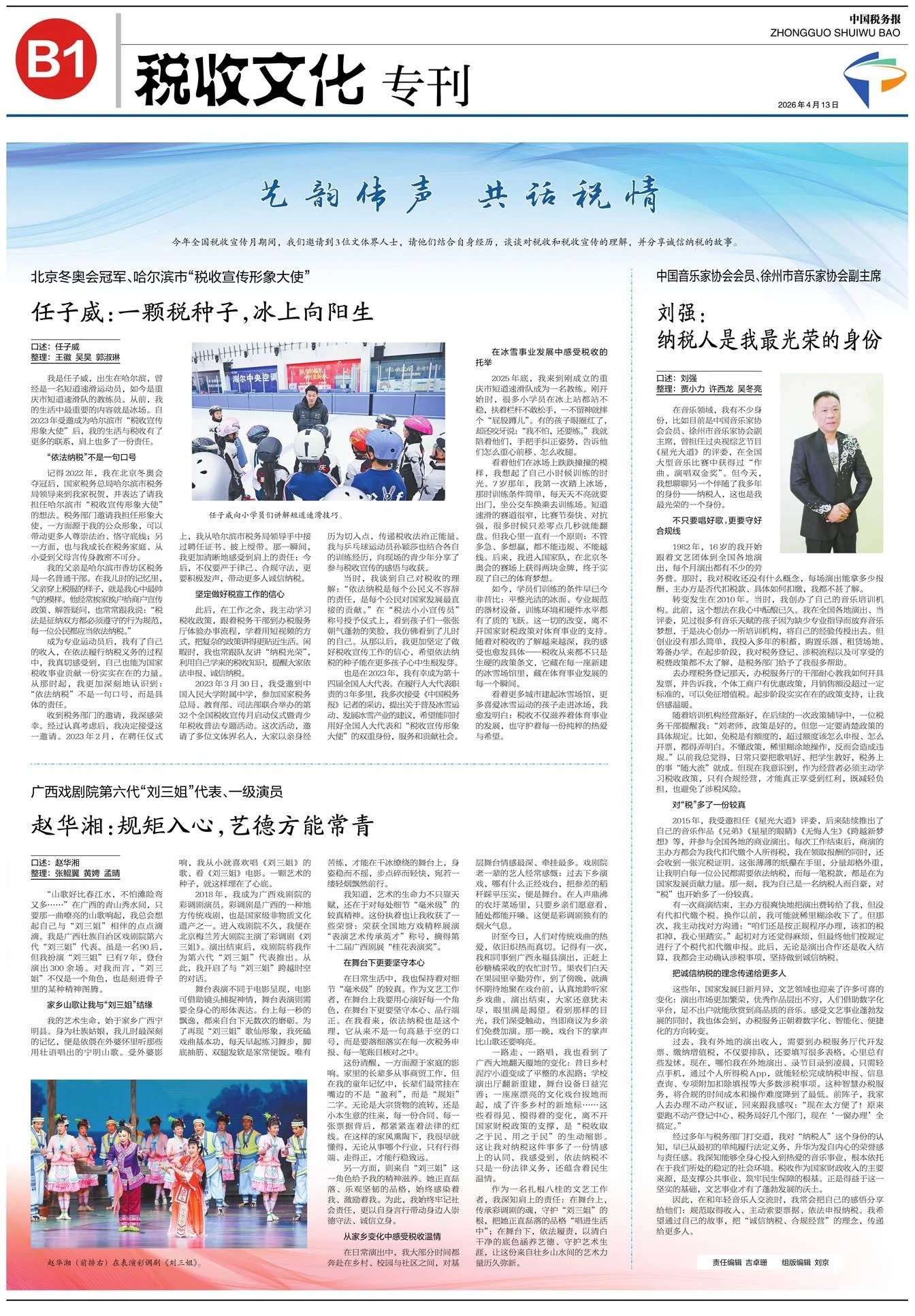 也是在2023年,我有幸成为第十四届全国人大代表。在履行人大代表职责的3年多里,我多次接受《中国税务报》记者的采访,提出关于普及冰雪运动、发展冰雪产业的建议,希望能同时用好全国人大代表和“税收宣传形象大使”的双重身份,服务和贡献社会。
