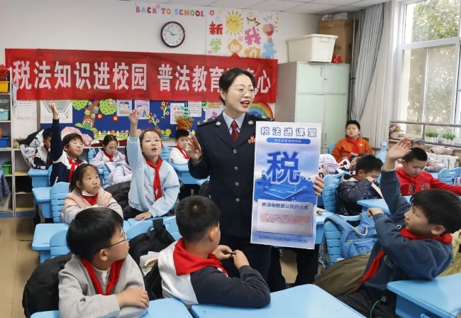 在青岛,市北区税务局面向“园区、街区、校区”三个代表性区域构建全维度税收普法矩阵,最大限度提升税收普法覆盖率、知晓度和实效性。税务干部走进青岛上清路小学,为孩子们带来生动有趣的税收普法教育课。